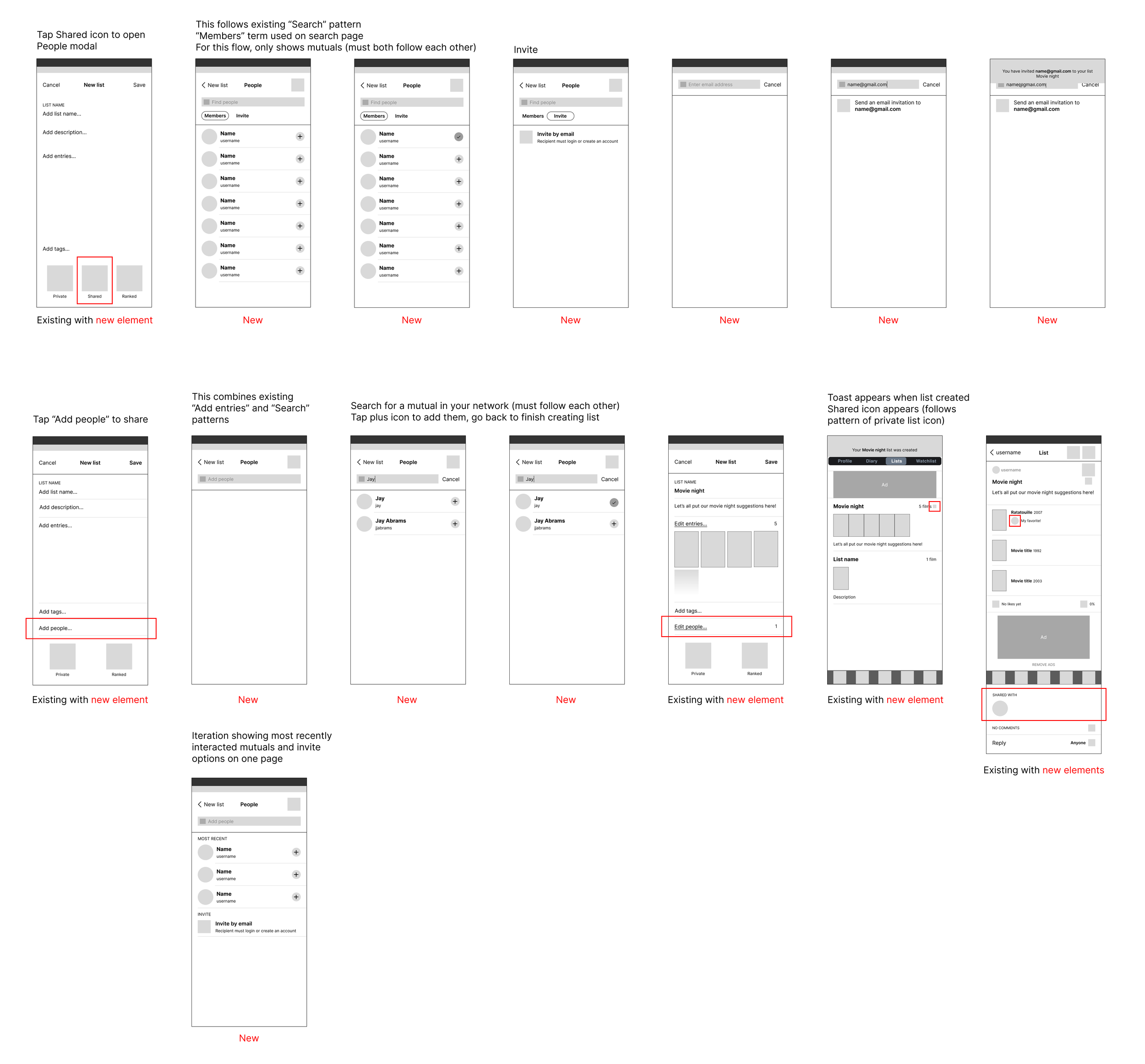 I started with lo-fi wireframe sketches of how I thought a collaborative feature could be integrated into the existing app. Two main options appeared - creating a large icon to Share, or a link to Add People.