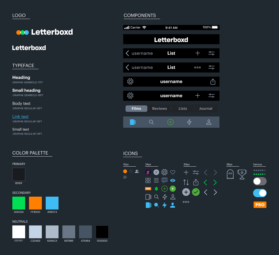 Here I documented the existing logo, font, and color choices, and app-wide components. Many different shades of grey were used which presented a challenge, so I represented the most common and the ones I used. There are many icons of various sizes, which I kept consistent in the design and had to replicate some of them in vector for my use.