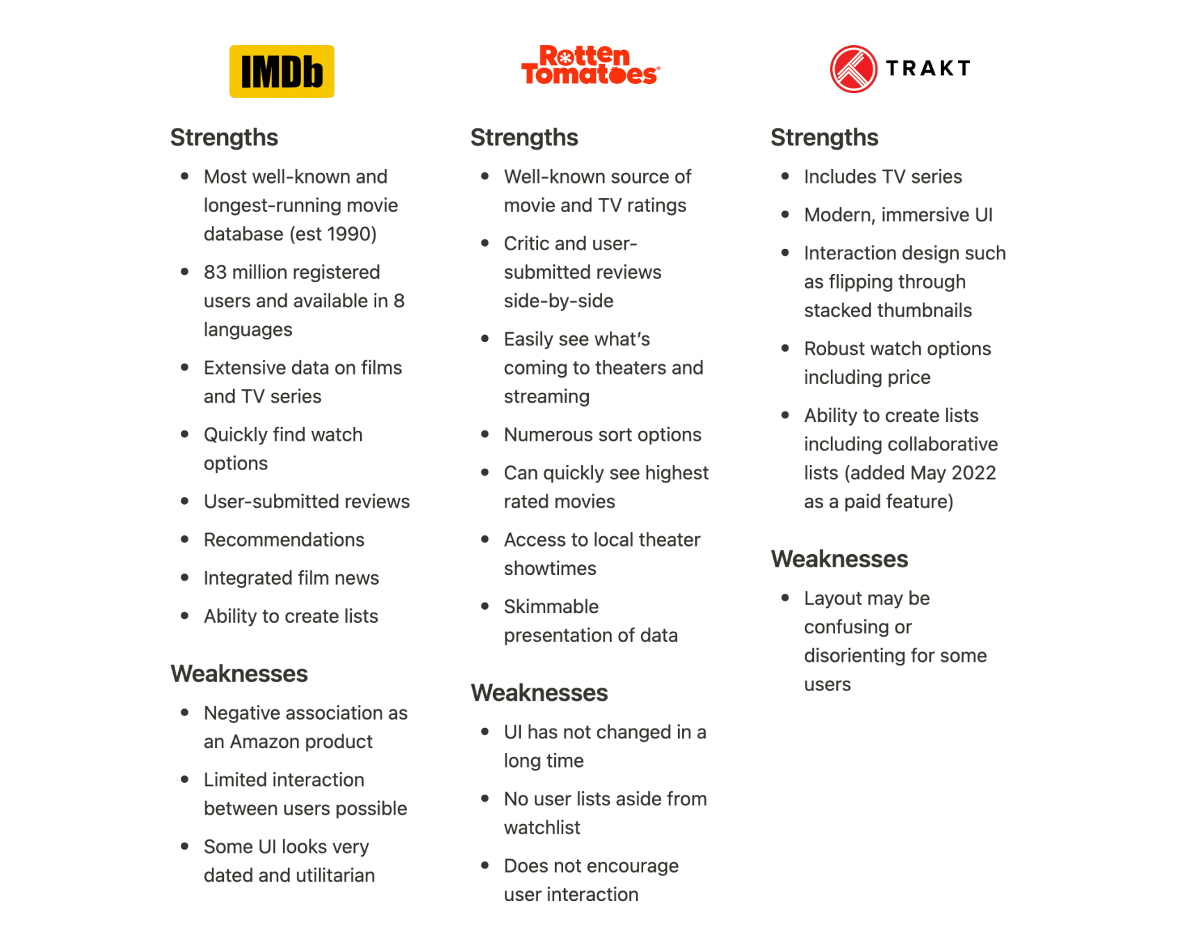 I examined other popular film sites, and although they are very well-established, few had any features with a social focus like Letterboxd. Trakt is the only one with collaborative lists as a paid feature, so there is ample opportunity here to implement a highly desired feature that could bring newcomers and satisfy existing users.
