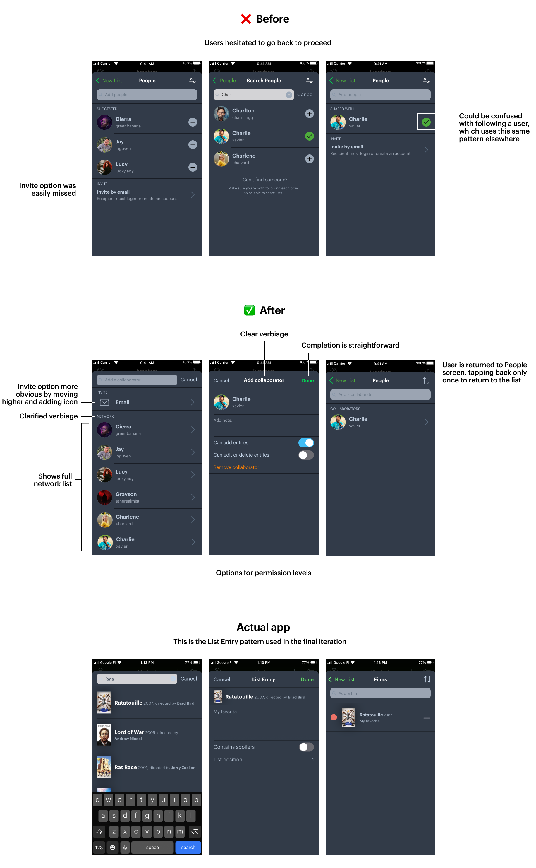A frustrating and common design pattern on the app presents the user with a blank screen instead of suggesting an action to be taken. To avoid this, I had the suggested section only appear if the list isn’t shared with anyone. Once a collaborator is added, they appear on the main screen and suggestions can be found when searching for someone to add.