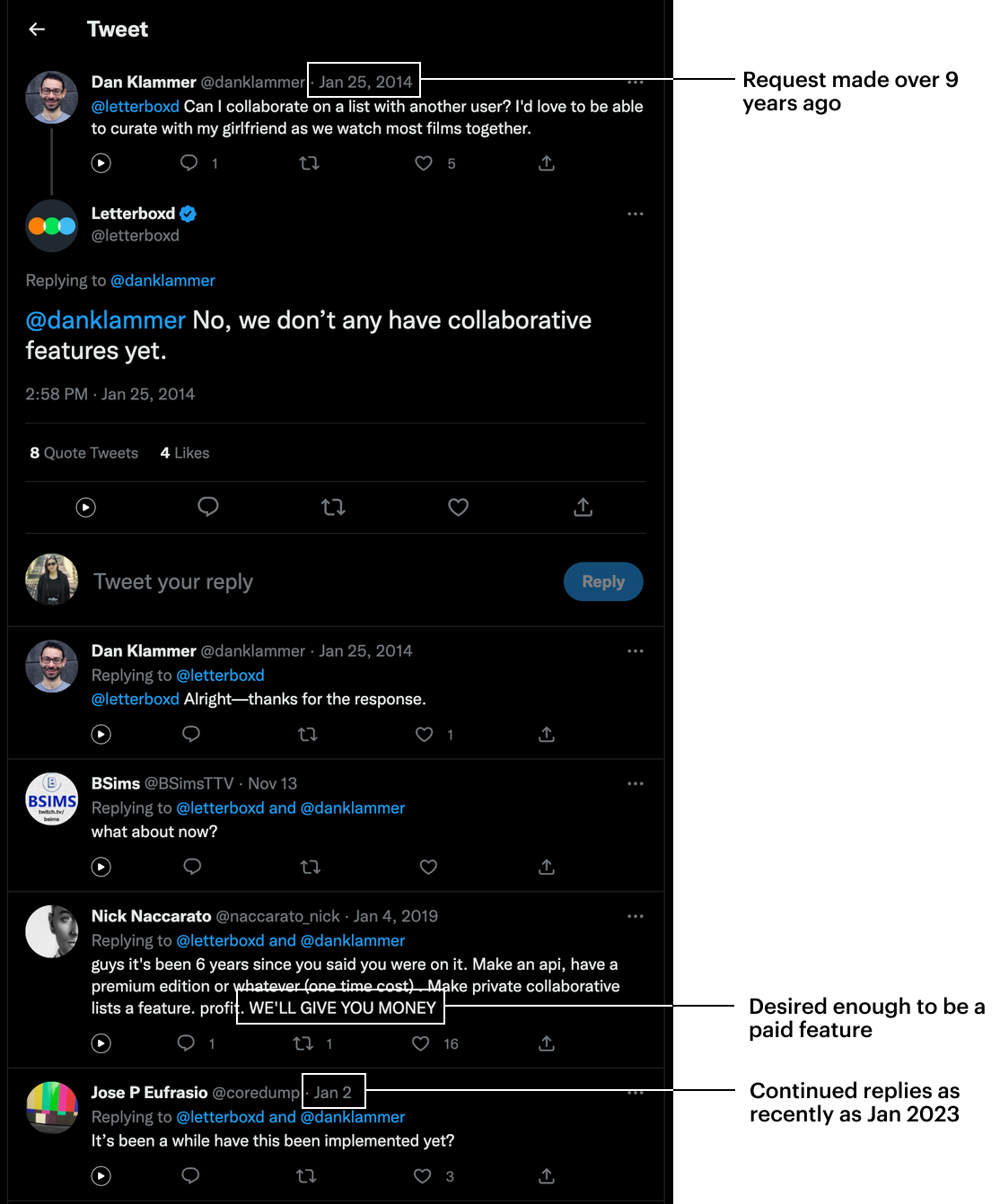 I researched what Letterboxd users were saying on Reddit and Twitter, especially about wanting a collaborative list feature. Because this conversation was so common among users, it confirmed my assumption that this is a desired feature and substantial enough for this project.